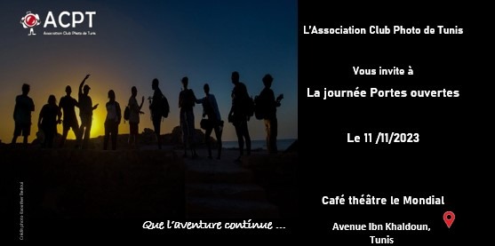 Vous êtes amateur, passionné de photographie, débutant ou confirmé, soyez les bienvenus à la journée porte ouverte qui aura lieu au Café Théâtre Le Mondial avenue Ibn Khaldoun le 11 Novembre 2023 à partir de 14h30.