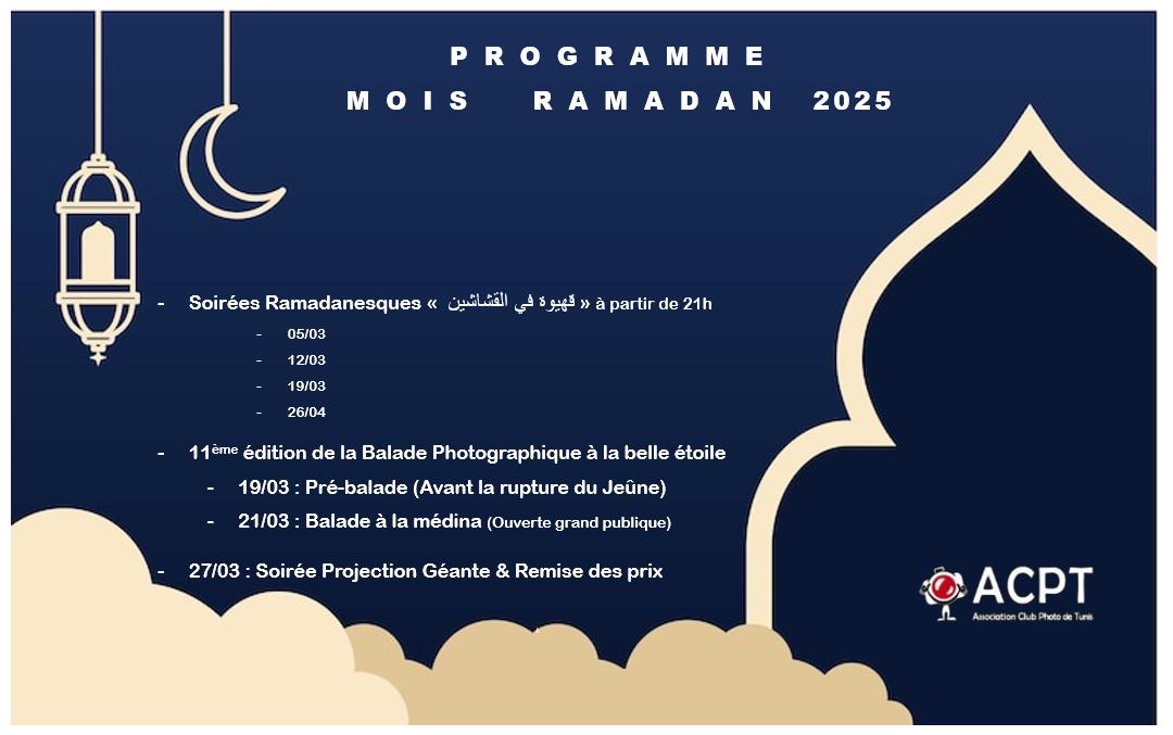 Ce programme inclut des soirées ramadanesques régulières, une balade photographique en deux parties, et une soirée de projection avec remise de prix.
