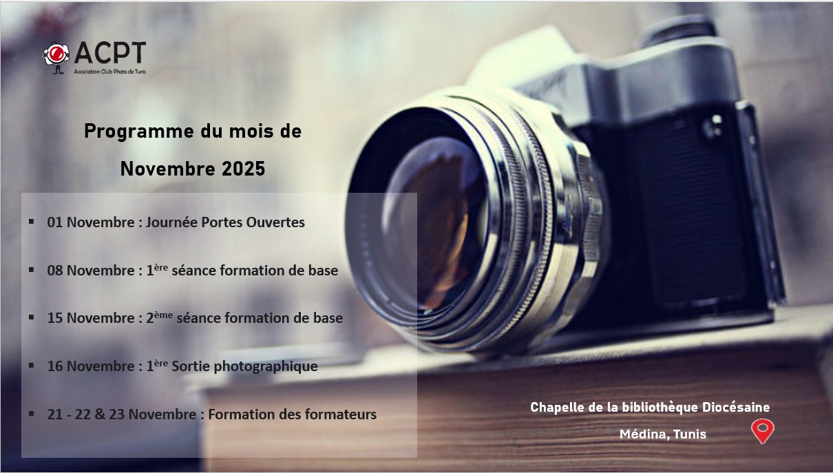 Le mois de novembre s’annonce riche en activités photographiques et en moments de partage pour les membres de l’ACPT. Entre formations, sorties et échanges, chaque événement a été pensé pour développer les compétences techniques et nourrir la créativité des passionnés d’image.